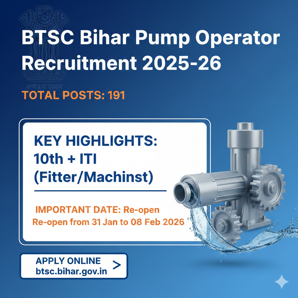 Bihar Technical Service Commission (BTSC) has released the official notification (Advt. No. 32/2025) for the recruitment of Pump Operator posts. A total of 191 vacancies have been announced.