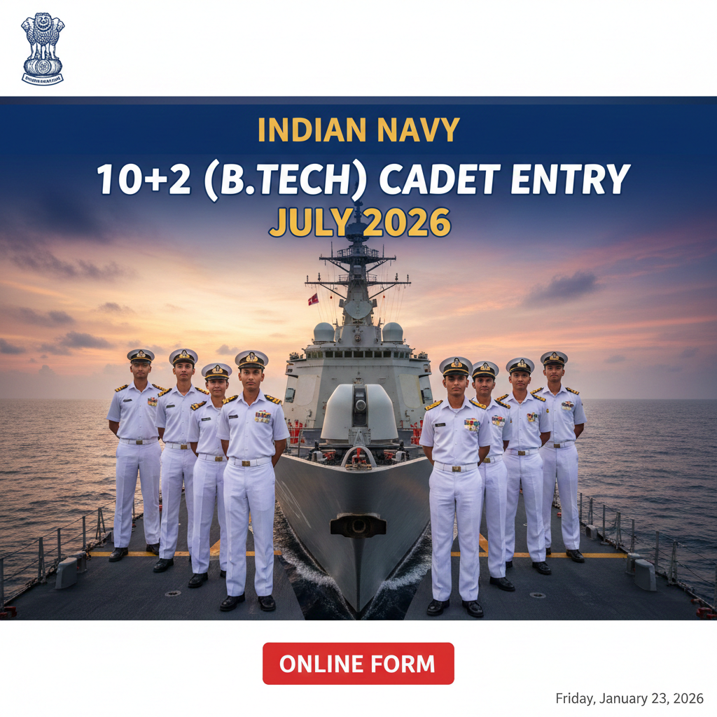 Indian Navy ने 10+2 (B.Tech) Cadet Entry Scheme July 2026 के लिए Unmarried Male & Female Candidates से Online Application आमंत्रित की है। इच्छुक उम्मीदवार नीचे दिए गए विवरण को ध्यान से पढ़कर Online Apply कर सकते हैं।